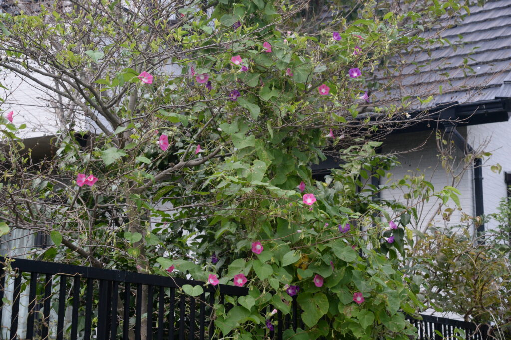 フェンスから立木へと侵食。写ってはいないが、この左側も西洋朝顔だらけ。花の色が安っぽく、葉の形も朝顔独特の切れ込みが見られない(写真で分かるかな)。別の植物みたい。