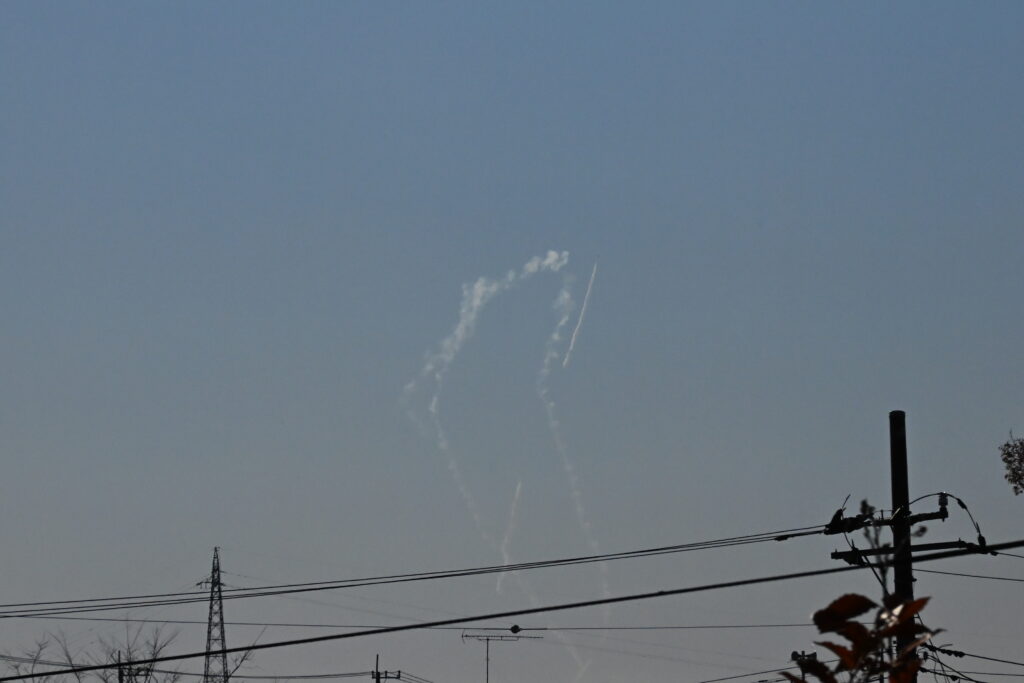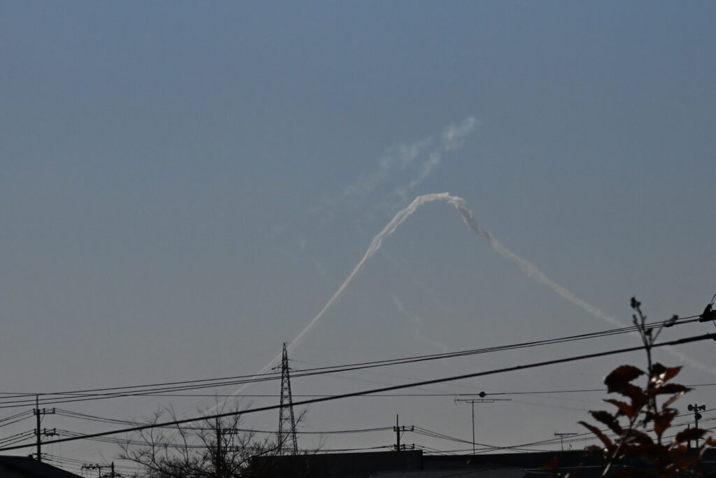 あきらめかけたその時、予想していた場所にスモークが立ち上がるのが見えた。やたっ!見えるやんけ。我が家でブルーインパルス観るの、何年ぶりだろう。というか、これ、ブルーインパルスを観たって言えるのかな。